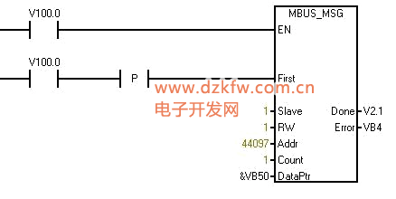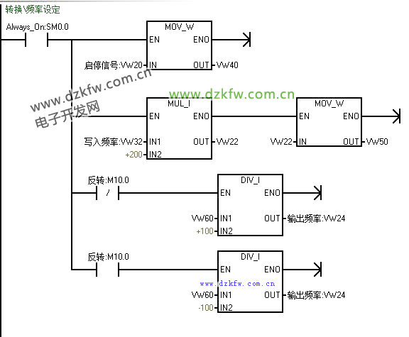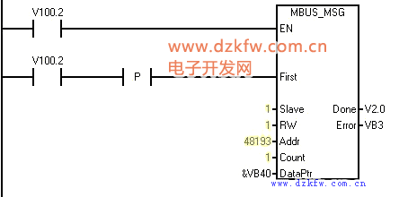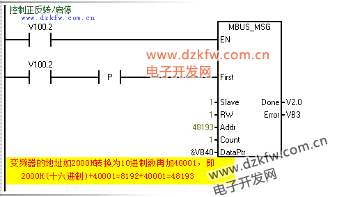 PLC中地址為:變頻器的地址如2000H轉換為10進制數再加40001,即8192(2000H)+40001=48193,所以命令地址為48193。寫入“1”變頻器正轉;寫入“2”變頻器反轉;寫入“5”變頻器自由停機。