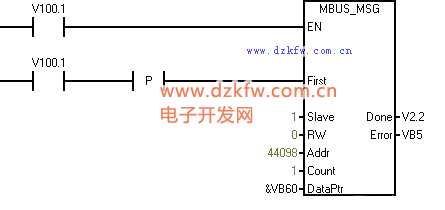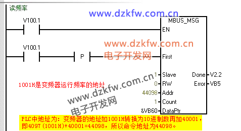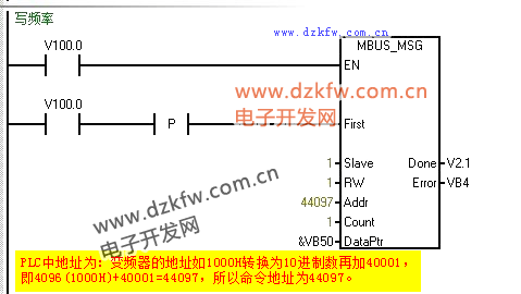PLC中地址為:變頻器的地址如1001H轉換為10進制數再加40001,即4097(1001H)+40001=44098,所以命令地址為44098。需要注意一點