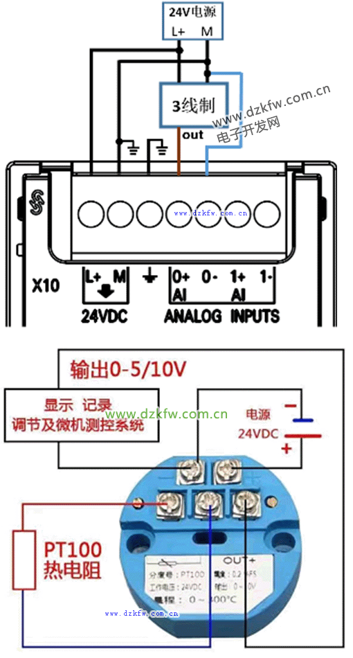 該項目案例加熱器檢測溫度用的是傳感器,選用的是PT100熱電阻,不能直接接入模擬量模塊,因此需要使用溫度變送器把信號轉換成標準信號才行,具體接線如圖2 所示。