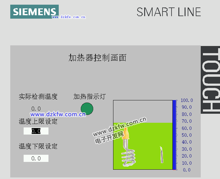 假設現有一加熱器對容器進行加熱,圖1為控制示意圖;容器中通過溫度傳感器進行溫度檢測,當溫度低于設定下限溫度時,啟動加熱器進行加熱,當溫度高于上限設定溫度時,關閉加熱器加熱,其中溫度傳感器模擬量輸出信號類型為0到10V,傳感器測量范圍為0到100攝氏度。