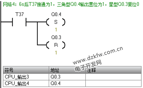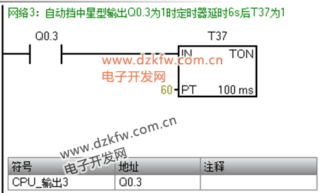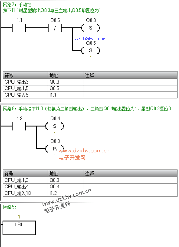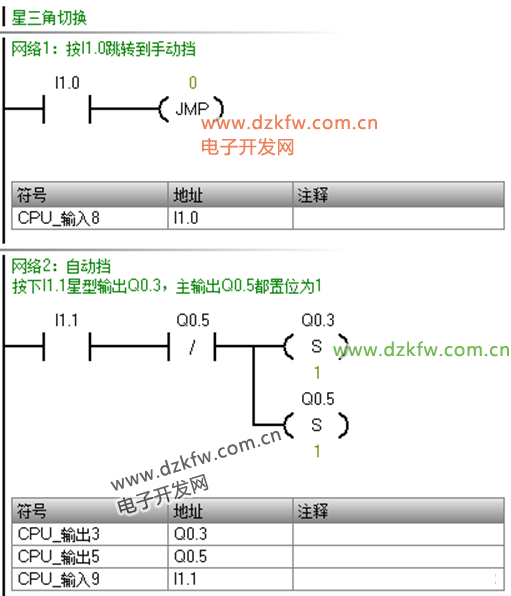 例如:電動機的星/三角啟動/停止控制系統。星Q0.3、角Q0.4、主Q0.5;按下I1.1通電,進入自動擋模式,6s后自動星型轉三角形;按下I1.0切換至手動模式,按下I1.1通電為星型啟動,按下I1.2后等待6s轉換成三角型;I1.3急停。