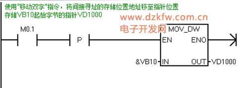 間接尋址使用指針訪問存儲器中的數據。指針是包含另一個存儲位置地址的雙字存儲位置。只能將 V 存儲位置、L 存儲位置或累加器寄存器(AC1AC2AC3)用作指針。要創建指針,必須使用“移動雙字”指令,將間接尋址的存儲位置地址移至指針位置。指針還可以作為參數傳遞至子例程。