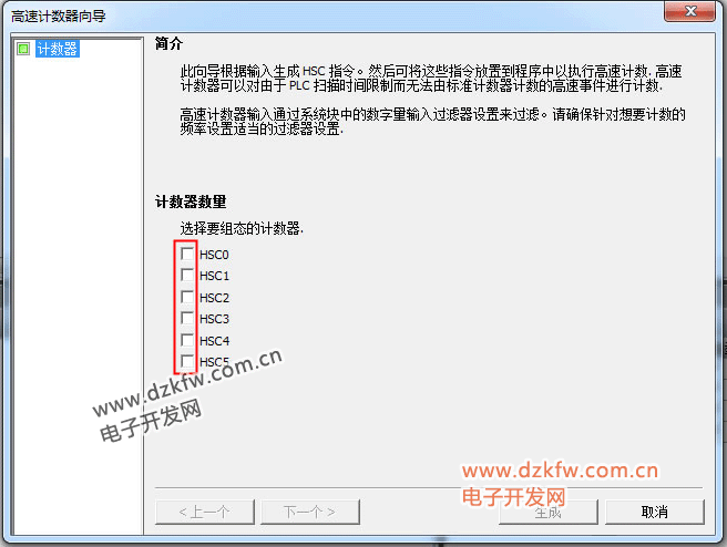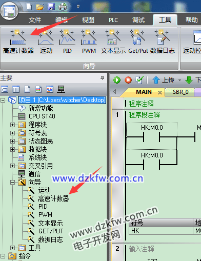 在 Micro/WIN SMART 中的命令菜單中選擇 Tools(工具)> Wizards(向導)中選擇 High Speed Counter(高速計數器向導) ,也可以在項目樹中選擇 Wizards(向導)文件夾中的 High Speed Counter(高速計數器向導)按鈕。