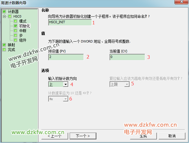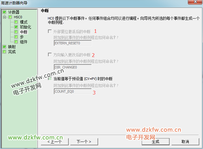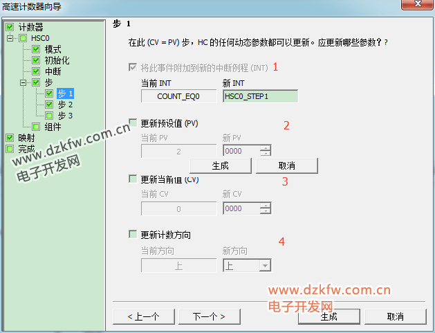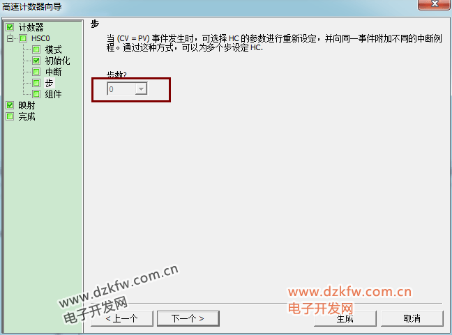 3.當前值等于預置值時產生的中斷,通過向導,可以在該中斷的服務程序中重新設置高速計數器的參數,如預置值、當前值。一個這樣的過程稱為‘一步‘。