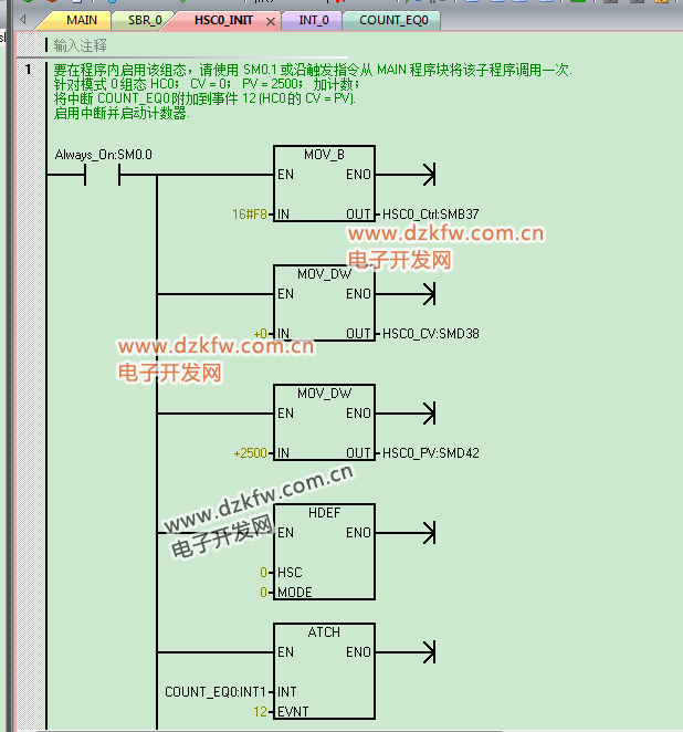 HSC_INIT 為初始化子程序,請在主程序塊中使用 SM0.1 或一條邊沿觸發指令調用一次此子程序。