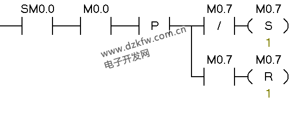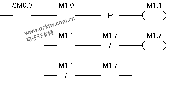 第二個線圈程序:M1.1常閉觸點閉合+M1.7常開觸點閉合→M1.7線圈得電當前掃描周期開始時M0.7已得電