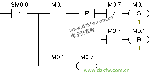 第一個線圈程序:M0.0按鈕按下+常閉觸點M0.7斷開→M0.1線圈不置位