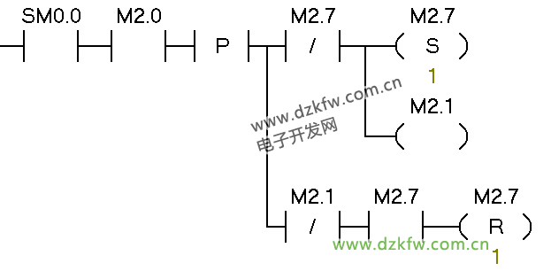 第一個線圈程序:M2.0按鈕按下+常閉觸點M2.7斷開→M2.7線圈不置位