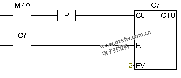 計數程序:M7.0按鈕按下→C7=2→C7常開觸點閉合→置位C7→C7=0