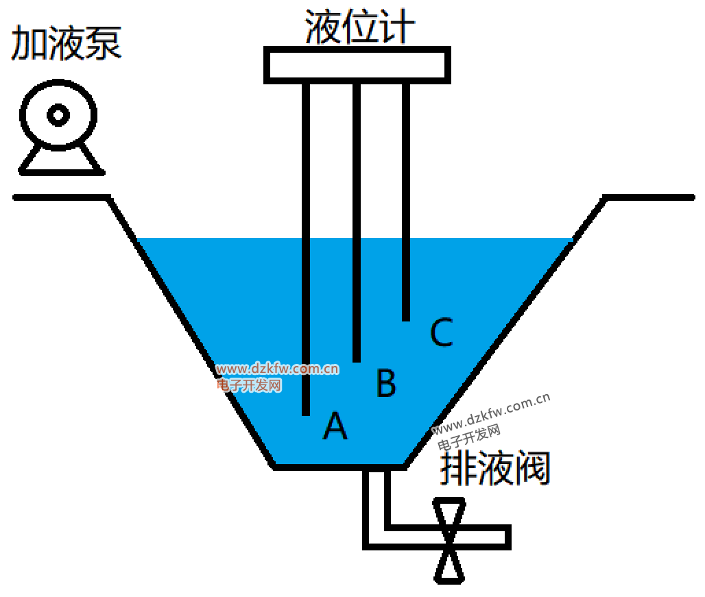 汽車涂裝前處理生產(chǎn)線中的磷化槽示意圖如圖所示,汽車車身掛在輸送鏈上,經(jīng)過磷化槽時會被涂上一層磷化膜。要求磷化液要保持一定的液位深度,而這個液位是由液位計來進(jìn)行檢測,分為高液位A、低液位B和極低液位C,液位的控制是通過加液泵和排液閥來進(jìn)行實現(xiàn)的。