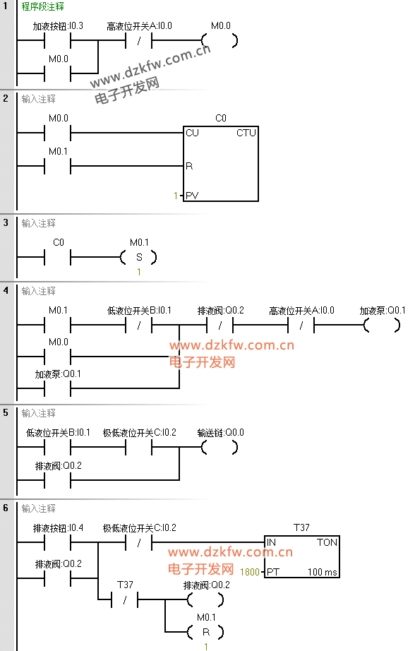 當(dāng)按下I0.3按鈕時,M0.0得電并自保持,同時計數(shù)器計數(shù)值加1,等于設(shè)定值時C0觸點接通,并置位M0.1,這是工作周期的開始,開始時液化槽中是空的,三個液位傳感器開關(guān)都沒有信號輸入,I0.0、I0.1常閉是接通的,因為M0.1接通,此時Q0.1得電并自鎖,加液泵啟動,開始往磷化槽加液。開始時由于液位較淺,輸送鏈?zhǔn)遣粏拥模S著液位的增加,到達(dá)低液位,B液位傳感器信號I0.1接通,I0.0也是接通的,所有Q0.0輸出,啟動輸送鏈。當(dāng)液位到達(dá)高液位時,A液位傳感器信號I0.0接通,程序段4中的I0.0常閉點斷開,Q0.1失電,加液泵停止工作。