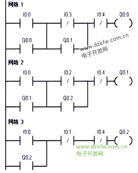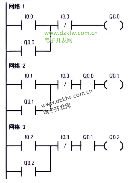 2. 單向順序停止控制電路就是要求按一定順序停止已經執行的各機構。只有 Q0.2被停止后才可以停止 Q0.1,若想停止 Q0.0,則必須先停止 Q0.1。I0.4 為急停按鈕。