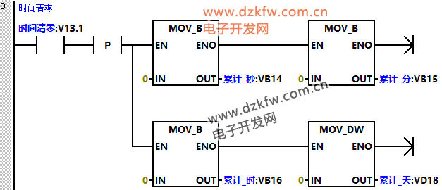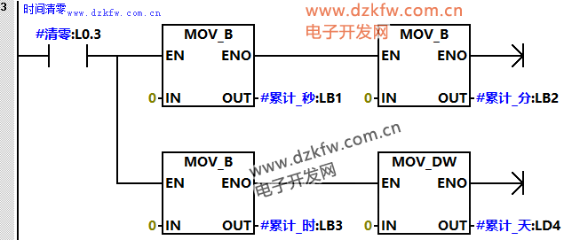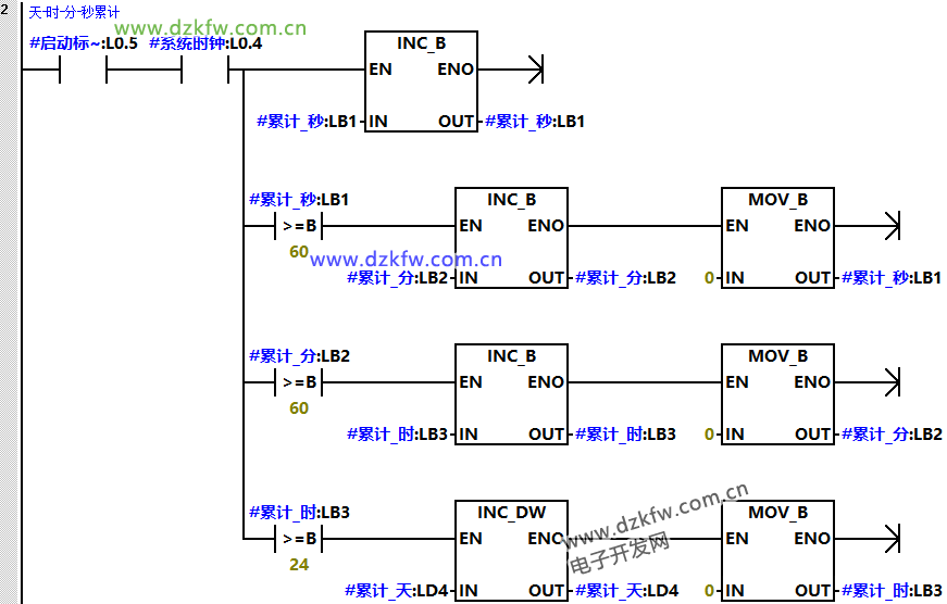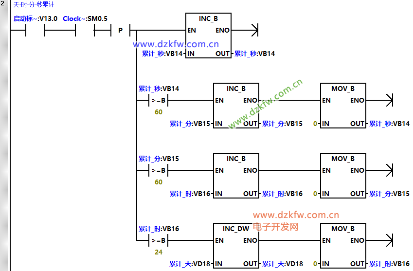 (2)程序段2是當啟動標志位接通之后,利用系統時鐘1HZ脈沖接通“秒”累計,當到達60秒后“分鐘”地址加1,同時“秒鐘”清零;當到達60分鐘后小時地址加1,同時“分鐘”清零;當到達24小時后“天”地址加1,同時“小時”清零。