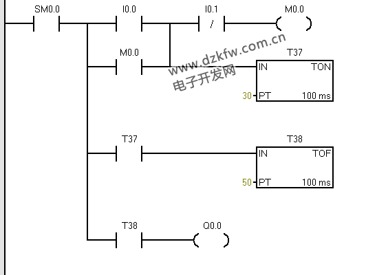 延時啟動延時停止:按下啟動按鈕I0.0延時3秒電機啟動,按下停止按鈕I0.1延時5秒電機停止,電機控制輸出點為Q0.0;
