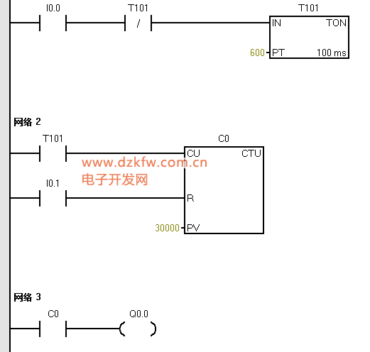 I0.0為設備運行反饋,I0.1為復位信號,Q0.0是保養提示警報。