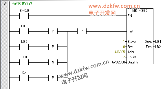 通過MB_MSG,向1號從站讀取從36865(Addr)這個地址開始2位(Count)的數(shù)據(jù),并把讀取到的數(shù)據(jù)寫入VB2000