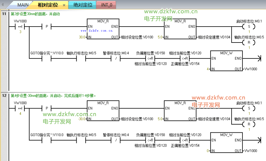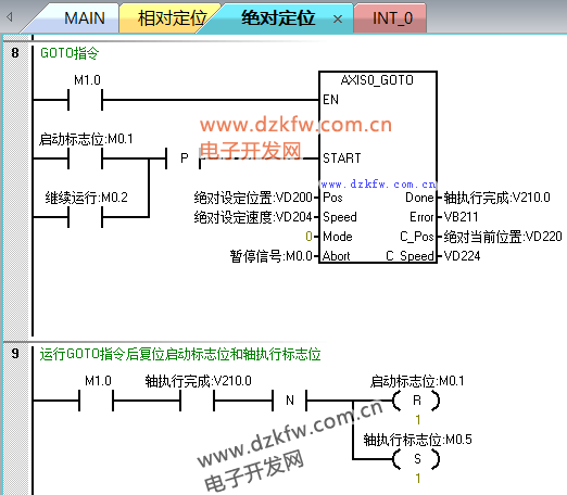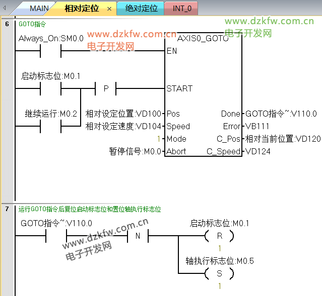 相對定位的需要記錄運行前的位置,暫停后把當前位置和運行前的位置進行運算,繼續運行時把剩余距離賦值到GOTO指令中的設定位置,具體程序如圖3—圖7所示,程序有注釋講解,這里不做過多的介紹,有問題可以在評論留言。
