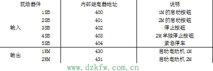I/O信號的地址分配表、PLC現場器件實際接線圖以及梯形圖如下圖所示。1KM控制1M啟動,2KM控制2M啟動。