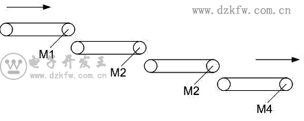 有一個用四條皮帶運輸機的傳輸系統,分別用四臺電動機M1~M4驅動,如圖1所示。控制要求如下: