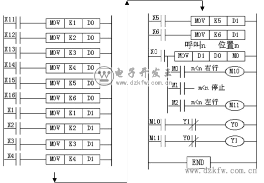 圖中將送料車當前位置送到數據寄存器 D0 中,將呼叫工作臺號送到數據寄存器 D1 中,然后通過 D0 與 D1 中數據的比較,決定送料車的運行方向和到達的目標位置。