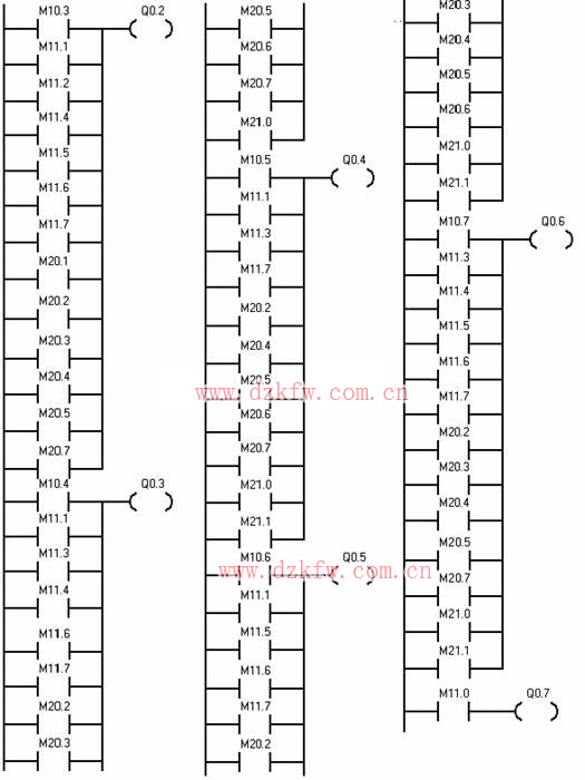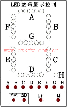上圖中,下框中的A、B…H分別接主機的輸出點Q0.0、Q0.1…Q0.7;SD接主機的輸入點I0.0。上框中的A、B、C、D、E、F、G、H用發光二極管模擬輸出。