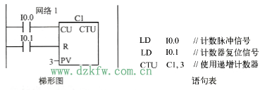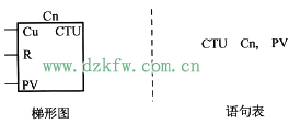 其中,CTU為遞增計數(shù)器指令助計符,Cn為計數(shù)器編號,CU為計數(shù)脈沖輸入端,R為復(fù)位輸入端,PV為設(shè)定值。