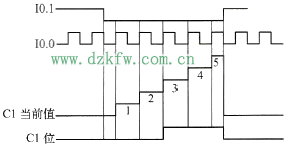 2)當(dāng)復(fù)位輸入(R)無效,即I0.1斷開為OFF時,在計數(shù)脈沖輸入端I0.0接通的上升沿,C1從當(dāng)前值(0)開始(加1)計數(shù)。