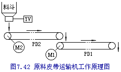 原料皮帶運輸機工作原理如圖所示。原料從料斗經兩臺皮帶機PD2、PD1輸送,向PD2供料由電磁閥YV控制,PD1和PD2分別由電動機M1和M2驅動、電磁閥YV由電磁鐵YA驅動。試設計其plc控制系統。