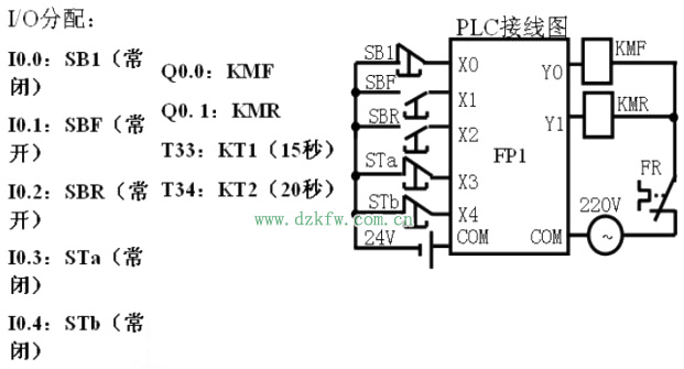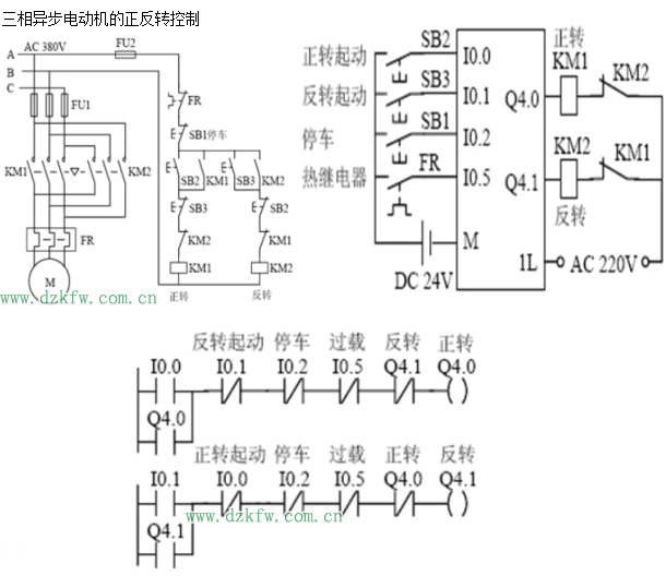 在電氣原理圖轉(zhuǎn)化為梯形圖的過程中,真正實(shí)現(xiàn)了一一對應(yīng)的關(guān)系,I0.0代表輸入,所接的就是電氣原理圖里面的啟動開關(guān),停車開關(guān),熱保護(hù)繼電器,Q4.0代表輸出,所接的是控制電機(jī)正反轉(zhuǎn)的交流接觸器(CJ),其實(shí)在轉(zhuǎn)化完之后的電路中,真實(shí)的電機(jī)只連接了熱保護(hù)繼電器和交流接觸器,需要人操作的按鈕全都接到了plc的輸入端。如下圖所示,可以看出圖中是能實(shí)現(xiàn)聯(lián)鎖保護(hù)的,而在PLC中完成聯(lián)鎖保護(hù)的目的就是使兩個(gè)輸出Q4.0和Q4.1不同時(shí)為零,在第一幅圖中可以看到,它的PLC連接圖并不是完全按照電氣連接圖設(shè)計(jì)的,它在外面還連接了接觸器,使之形成硬件的聯(lián)鎖保護(hù),這樣可靠性得到了進(jìn)一步提高。