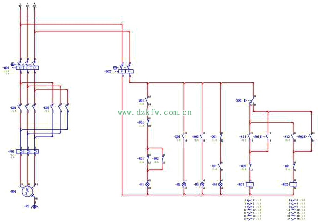 3、 遙控即由PLC進(jìn)行電機(jī)的啟停控制。PLC的輸出點(diǎn)(Q1.0、Q1.1)控制中間繼電器的線圈,從而控制接觸器-K01、-K02的吸合,達(dá)到控制電機(jī)啟停的目的。