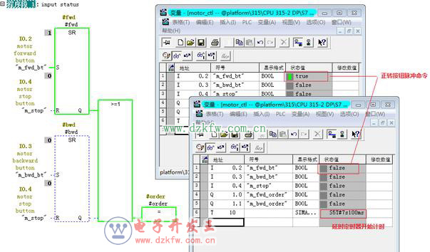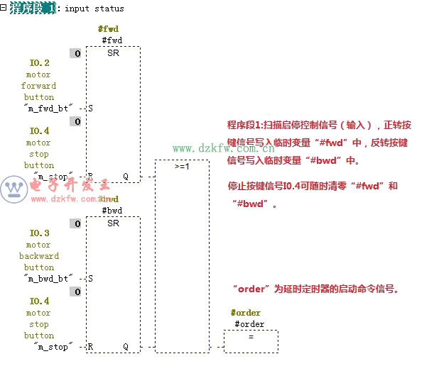 1、 按一下下-S11按鈕,PLC的I0.2輸入一個(gè)脈沖信號(hào),經(jīng)過"SR"觸發(fā)器(復(fù)位優(yōu)先),"#fwd"為1,且"或"運(yùn)算后的"#order"為1;