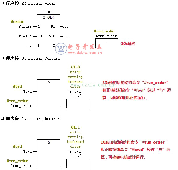4、 在上述過程中的任何時(shí)候,停止按鈕-S13按下,I0.4輸入的脈沖信號(hào)會(huì)使"#fwd"變?yōu)?,此時(shí),若電機(jī)正轉(zhuǎn),則電機(jī)停止運(yùn)行;若仍處于計(jì)時(shí)狀態(tài),則計(jì)時(shí)器停止計(jì)時(shí),直到下次有啟動(dòng)信號(hào)時(shí),在重新計(jì)時(shí)。