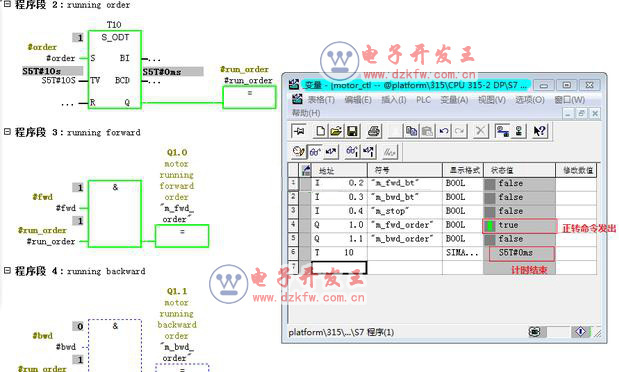 2、 I0.0、I0.1分別為電機(jī)正、反轉(zhuǎn)的狀態(tài)反饋信號(hào),當(dāng)正轉(zhuǎn)命令Q1.0=1時(shí),若一定時(shí)間后I0.0仍不變?yōu)?,則說明正轉(zhuǎn)啟動(dòng)失敗,此時(shí)要強(qiáng)制令Q1.0=0,且向系統(tǒng)報(bào)錯(cuò)。由于駝子太懶了,這部分功能就不做了,留到WinCC部分再一并加以討論。