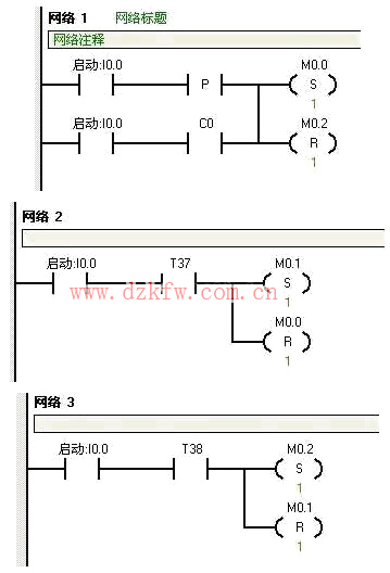 這3個(gè)網(wǎng)絡(luò)就是這個(gè)程序的主干,這也是一個(gè)簡單的順序控制,這個(gè)順序控制共有三步,分別與M0.0、M0.1、M0.2對應(yīng),每一次只有一步動作,前面的常開點(diǎn)是跳轉(zhuǎn)條件。比如:I0.0與T37(5秒)將M0.1置位并將M0.0復(fù)位,而第一步因?yàn)槌薎0.0啟動這個(gè)條件外,還有一個(gè)循環(huán)的條件,所以第一步共有2個(gè)條件。