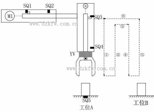 如上圖所示,M1為控制機(jī)械手左右移動(dòng)的電動(dòng)機(jī),M2為控制機(jī)械手上下升降的電動(dòng)機(jī),YV線圈用來控制機(jī)械手夾緊防松,SQ1為左到位檢測開關(guān),SQ2為右到位檢測開關(guān),SQ3為上到位檢測開關(guān),SQ4為下到位檢測開關(guān) ,SQ5為工件檢測開關(guān)。