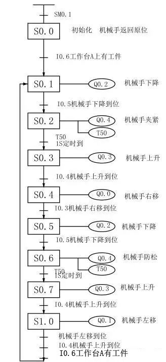 3.若原點(diǎn)條件滿足且SQ5閉合(工件A處有工件),按下啟動(dòng)按鈕,機(jī)械手按“原點(diǎn)→下降→夾緊→上升→右移→下降→防松→上升→左移→原點(diǎn)”的步驟工作。