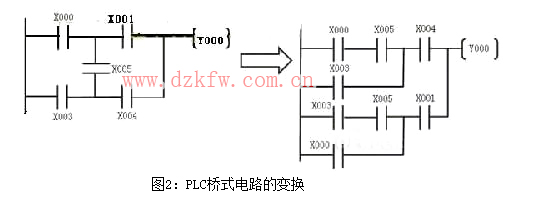 圖(b)中,X001和X002接點(diǎn)控制輔助繼電器M000,X003~X005接點(diǎn)控制輔助繼電器M001,再由兩個(gè)繼電器M000,M001接點(diǎn)的并聯(lián)組合去控制線圈Y000。這樣邏輯關(guān)系沒變,卻把雙線圈變成單線圈。