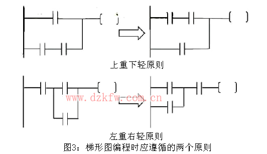 三,并聯(lián)塊串聯(lián)時(shí),應(yīng)將接點(diǎn)多的去路放在梯形圖左方(左重右輕原則);串聯(lián)塊并聯(lián)時(shí),應(yīng)將接點(diǎn)多的并聯(lián)去路放在梯形圖的上方(上重下輕的原則)。這樣做,程序簡潔,從而減少指令的掃描時(shí)間,這對(duì)于一些大型的程序尤為重要。如下圖所示: