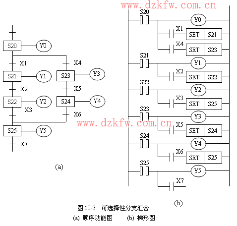 運用步進指令編寫順序控制程序時,首先應確定整個控制系統的流程,然后將復雜的任務或過程分解成若干個工序(狀態),最后弄清各工序成立的條件、工序轉移的條件和轉移的方向,這樣就可畫出順序功能圖。根據控制要求,采用STL、RET指令的步進順序控制可以有多種方式。如圖10-2所示是單流程順序功能圖。圖中M8002是特殊輔助繼電器,僅在運行開始時瞬間接通,產生初始脈沖。如圖10-3所示是選擇性分支與匯合狀態轉移方式。如圖10-4所示是并行分支與匯合狀態轉移方式。