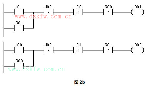 在圖2(a)中,Q0.0和Q0.1通過輸出進行互鎖,一個得電,另一個必須在停止前一個的基礎上才能啟動,即只能是先停后啟。