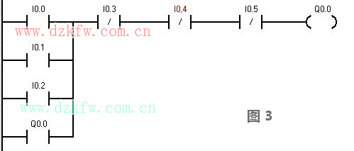 圖3所示是一個多地控制電路梯形圖。I0.0、I0.1、I0.2是多地啟動按鈕,I0.3、I0.4、I0.5是多地停止按鈕。
