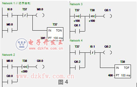 比如有3臺電動機,按啟動按鈕I0.0,3臺電動機Q0.0、Q0.1、Q0.2依次啟動;按停止按鈕I0.1,3臺電動機Q0. 0\Q0.1、Q0.2依次反向停止。這個程序在諸如皮帶機控制等順序控制機械中應用廣泛。順序控制梯形圖如圖4所示。