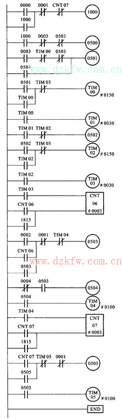按下啟動按鈕,0000為ON,1000為ON并自鎖,0500為ON,打開進水電磁閥。當水位到達高水位時,0003為ON,斷開進水電磁閥,同時0501為ON,電動機正轉,開始正向洗滌,并啟動定時器TIM00。15s后TIM00動作,使0501為OFF,停止正向洗滌,并啟動定時器TIM01,3s后TIM01動作,0502為ON,電動機反轉,開始反向洗滌,并啟動定時器TIM02。反洗15s后,TIM02動作,使0502為OFF,停止反向洗滌,并啟動定時器TIM03。經過3s的暫停,TIM03動作,使定時器TIM00、TIM01、TIM02、TIM03復位;使計數器CNT06計一次數,此時0501又為ON,重新進行從正向洗滌開始到反向洗滌結束的小循環。直到計數器CNT06計滿3次數時,CNT06為ON,第一次洗滌過程結束,同時使計數器CNT06 復位,為下一次洗滌過程的計數做好準備。在CNT06為ON的當前掃描周期,0503為ON,開始排水。當水位到達低水位時,0004由ON變為OFF,使0504為ON,接通脫水電磁離合器,并再次使0501為ON,使電動機正轉,開始脫水,并啟動定時器TIM04。10s后,TIM04動作,使脫水計數器CNT07計數一次,并使0503、0504為OFF,停止排水和脫水,結束從進水到脫水的一次大循環。兩個掃描周期后,0501再次為ON,重新進行從進水到脫水的下一次大循環,直到CNT07計滿3次后,使1000為OFF,結束洗衣的全部過程,0505為ON,報警蜂鳴器響10s后,停止報警。