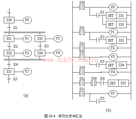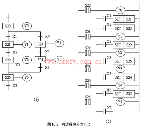 三菱plc編程梯形圖程序,運用步進指令編寫順序控制程序時,首先應確定整個控制系統的流程,然后將復雜的任務或過程分解成若干個工序(狀態),最后弄清各工序成立的條件、工序轉移的條件和轉移的方向,這樣就可畫出順序功能圖。根據控制要求,采用STL、RET指令的步進順序控制可以有多種方式。如圖10-2所示是單流程順序功能圖。圖中M8002是特殊輔助繼電器,僅在運行開始時瞬間接通,產生初始脈沖。如圖10-3所示是選擇性分支與匯合狀態轉移方式。如圖10-4所示是并行分支與匯合狀態轉移方式。