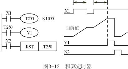 100ms積算定時器T250~T255的定時范圍為0.1~3276.7s。X1的常開觸點接通時(見圖3–12),T250的當(dāng)前值計數(shù)器對100ms時鐘脈沖進行累加計數(shù)。X1的常開觸點斷開或停電時停止定時,當(dāng)前值保持不變。X1的常開觸點再次接通或重新上電時繼續(xù)定時,累計時間(t1+t2)為1055×100ms=105.5s時,T250的觸點動作。因為積算定時器的線圈斷電時不會復(fù)位,需要用X2的常開觸點使T250強制復(fù)位。