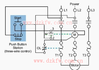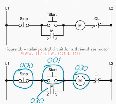 圖1顯示了三相電機及其相應的三線控制電路的接線圖,其中起動器的輔助觸點閉鎖了啟動按鈕。 要將此電路轉換為plc程序,首先要確定哪些控制設備將成為PLC I / O系統的一部分; 這些是圖2中帶圓圈的項目。在該電路中,啟動和停止按鈕(輸入)和啟動器線圈(輸出)將成為PLC系統的一部分。