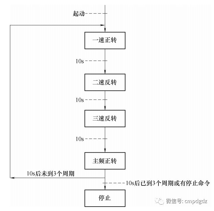 如果變頻器沒有故障且控制臺沒有急停命令時, 給出起動命令后, 變頻器將按照下圖所示的順序流程動作, 如果沒有給出停止命令, 自動運行三個動作周期后自動停止; 如果途中給出停止命令, 將在本動作周期結束時停止; 如果途中變頻器產生故障或者控制臺給出急停命令時, 將會馬上停止。