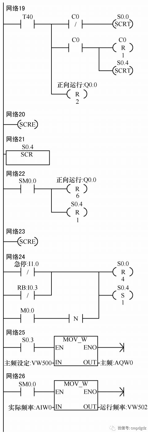 S0.3步控制變頻器以主頻速度正向運行, 主頻由PLC的VW500給定, VW500數值0代表0Hz,VW500數值32000代表60Hz。