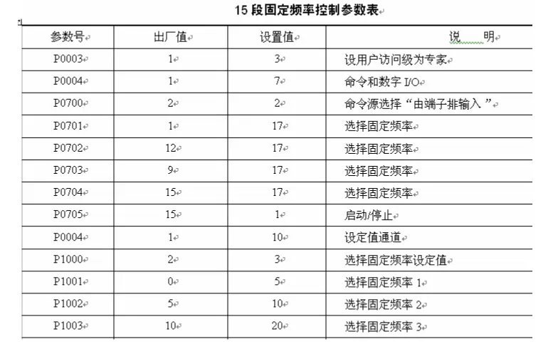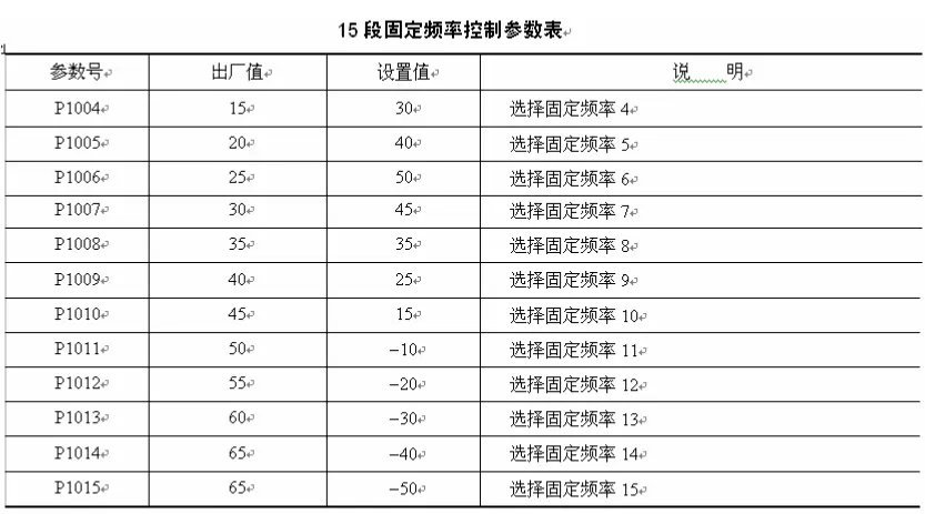 (4)設置MM440的15段固定頻率控制參數,如下表所示。