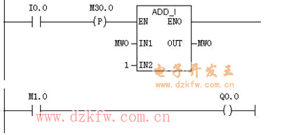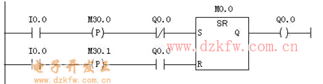 即用一個SR觸發(fā)指令實(shí)現(xiàn),其I0.0為啟動按鈕,Q0.0為控制輸出端。Q0.0=1為啟動運(yùn)行。Q0.0=0為停止運(yùn)行。